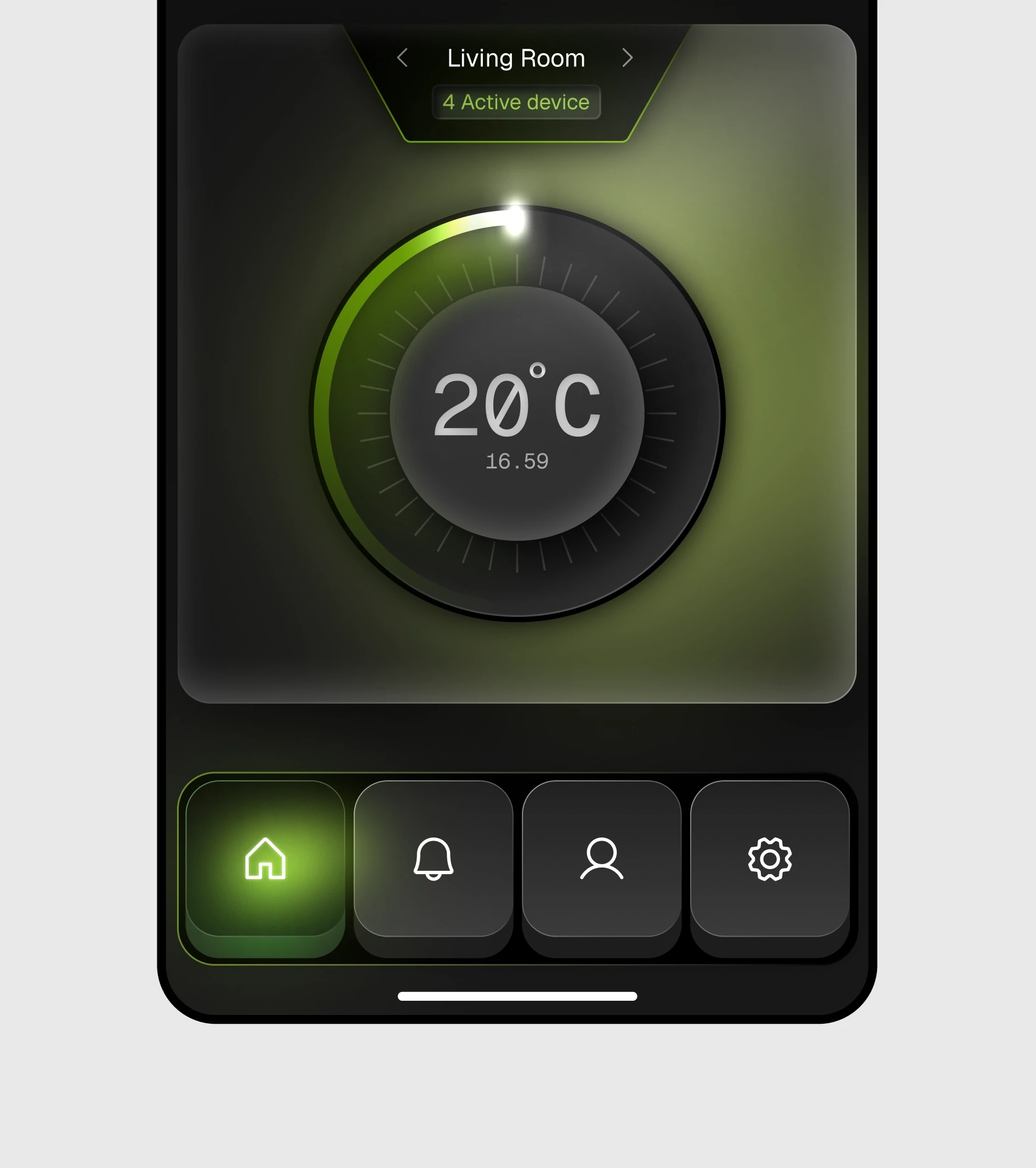 A skeuomorphic thermostat widget designed to control and monitor room temperature through a tactile, dial-based interface. The circular knob mimics a physical temperature controller, with depth, soft shadows, and a glowing progress arc to indicate the active temperature range. The center display shows the current temperature clearly, while the outer ring provides visual feedback as the dial is adjusted. Subtle lighting, gradients, and reflections reinforce a realistic, hardware-inspired feel, making the interaction intuitive and familiar. Ideal for smart home dashboards, desktop control panels, or IoT interfaces where clarity, realism, and precision are essential.
